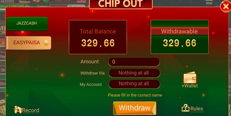 Withdrawals are simple: choose your wallet, enter amount, and confirm to receive funds directly to your Easypaisa or JazzCash account.